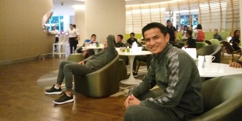 ANJU CHRISTIAN/ Jurnalis BOLA, Kukuh Wahyudi, berfoto bersama pelatih Thailand, Kiatisuk Senamuang, di Novotel Araneta Center, Manila, 21 November 2016.