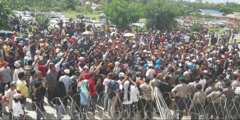 Ratusan personel polisi mengamankan aksi ini, dan kawat berduri mengeliling kantor KPU Kendari.