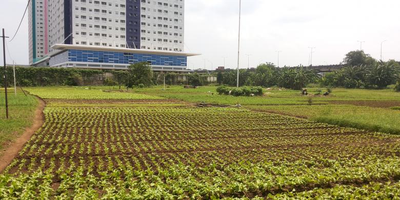 Lahan itu berada persis di sebelah Kompleks Apartemen Green Pramuka. Beragam komoditas sayur mayur tampak ditanam di lokasi tersebut, akan dari kangkung, selada, bayam, sawi, hingga singkong.