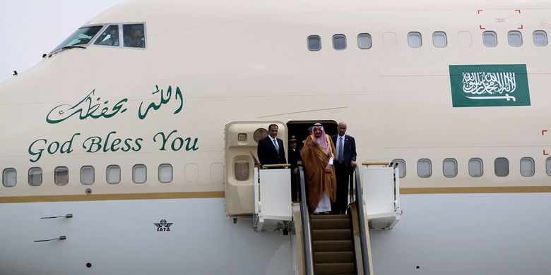 Raja Salman memakai sesuatu pesawat khusus kerajaan dengan nomor penerbangan SVA 1 STA 17.45LT/04Mar, STd TBA, typeB744, rute HLP-BWN-DPS-RON.