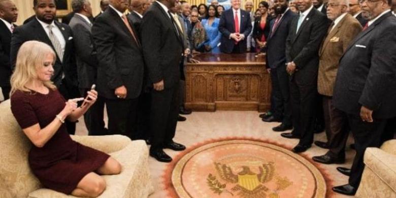 "Apa yg kamu lakukan di sofa itu Kellyane Conway? Tak kelihatan terhormat di Ruang Oval," ujar seorang netizen.